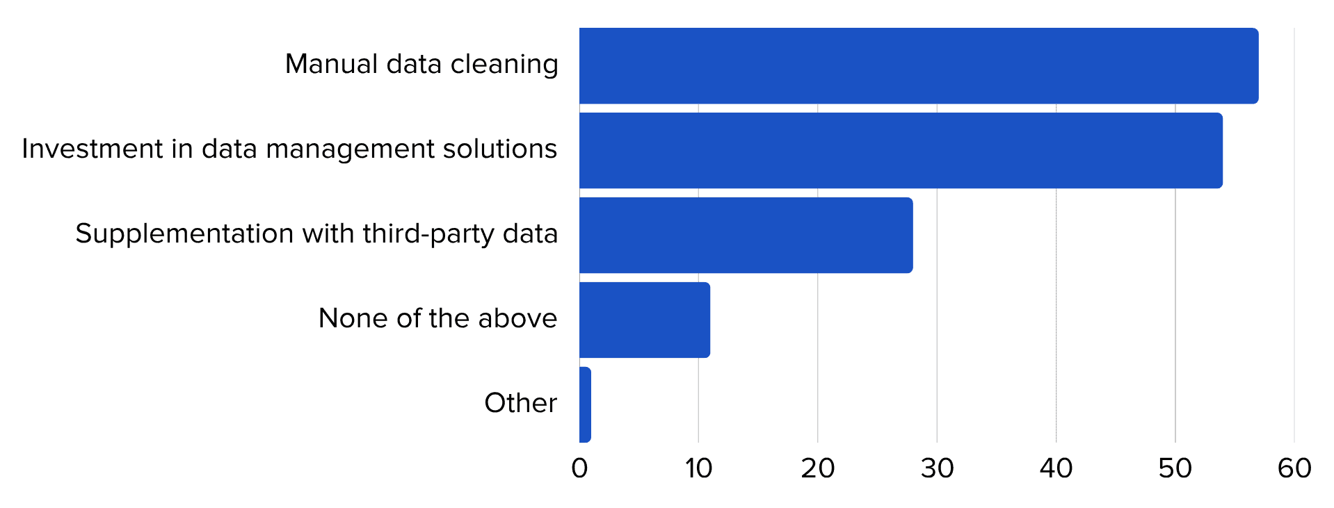 Over half of respondents said their organization relies on manual data cleaning efforts to improve CRM quality—an eight percent increase from last year. While this hands-on approach can yield quick wins, it’s time-consuming, error-prone, and difficult to scale across large, complex data environments.